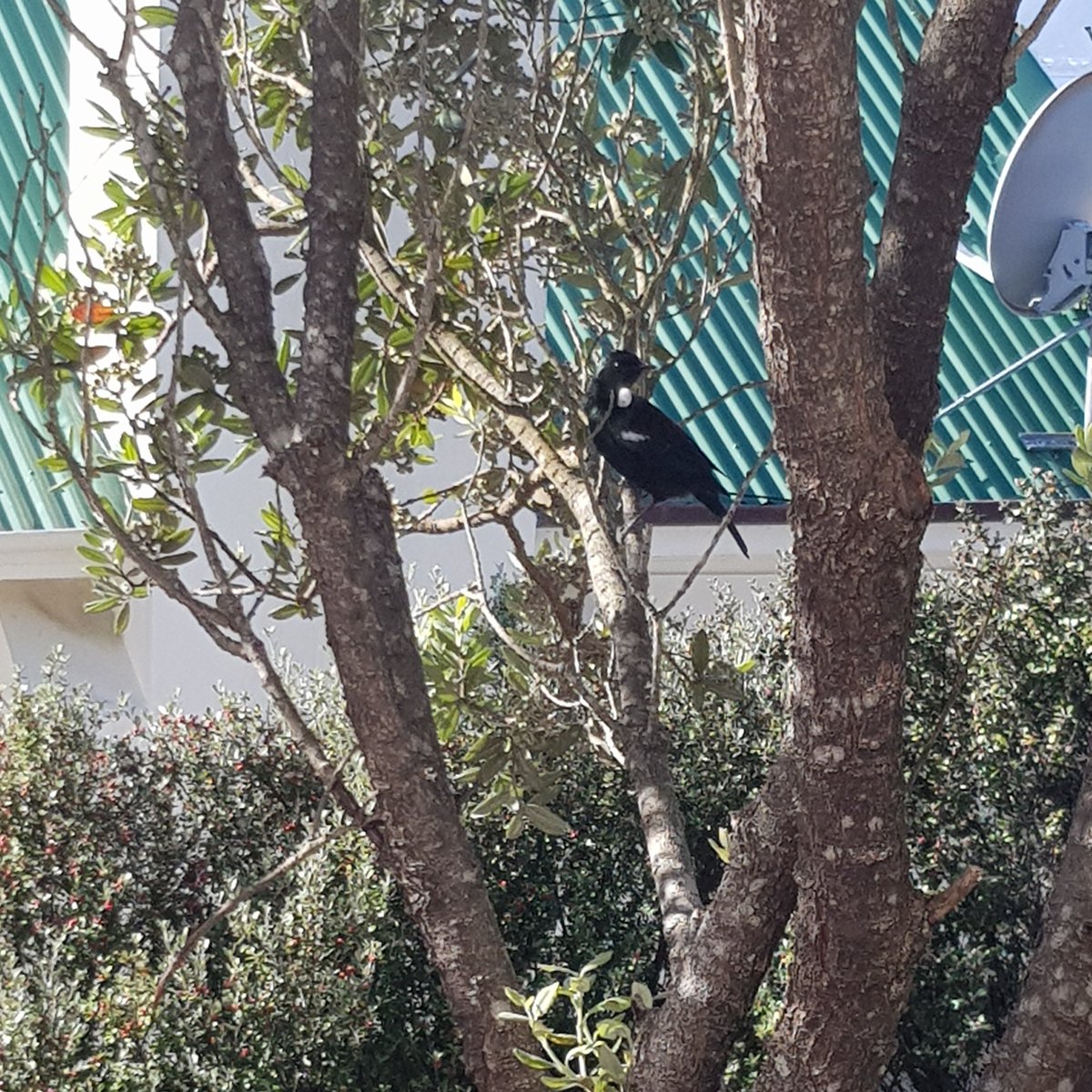 Numerous tui visiting to eat ripe coprosma berries you can see in the background. They sit in the pohutakawa, luminescent in the sun, digesting.pic.twitter.com/7NeacpP1Xk