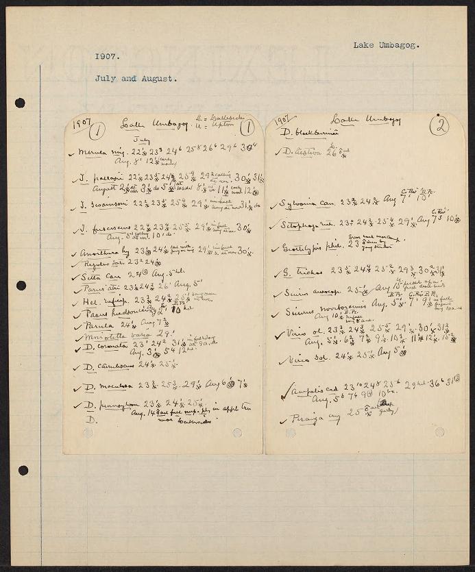 Ornithologist William Brewster's journals record species observations, animal behaviors, ecosystem changes & weather/temperature data.