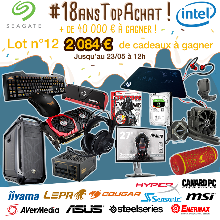 On enchaine avec l'imposant #Lot12 d'une valeur de 2 084 € ! Pour participer, RT + Follow@TopAchat ;-)pic.twitter.com/T9Xgnhlme6