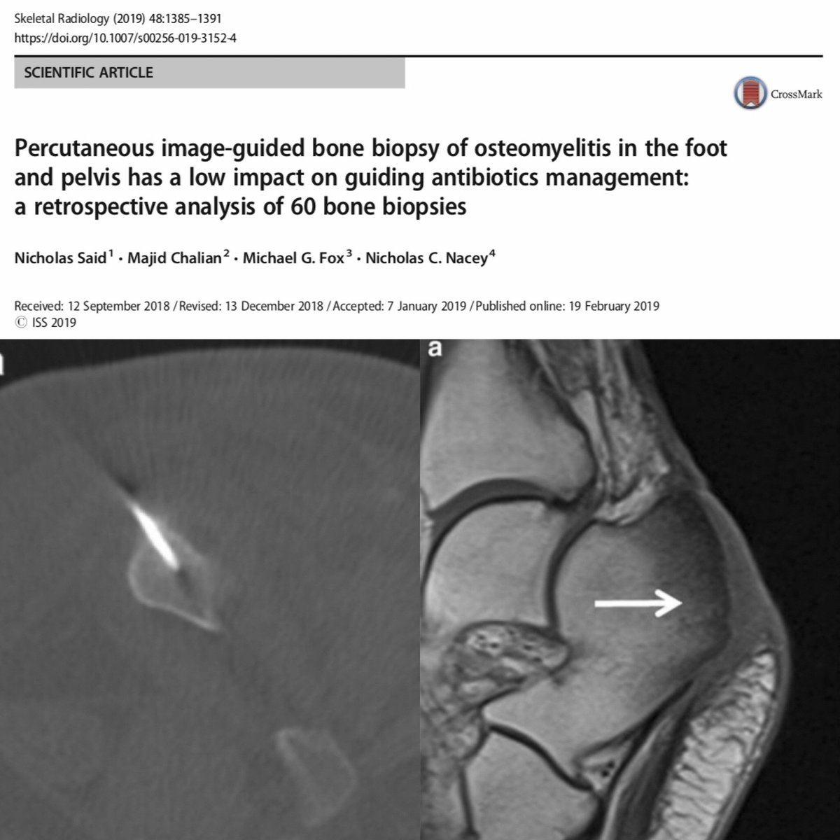 Percutaneous image-guided bone biopsy of osteomyelitis in the foot and pelvis has a low impact on guiding antibiotics management: a retrospective analysis of 60 bone biopsies by Said et al. https://doi.org/10.1007/s00256-019-3152-4 …pic.twitter.com/rqr8OJMXlY