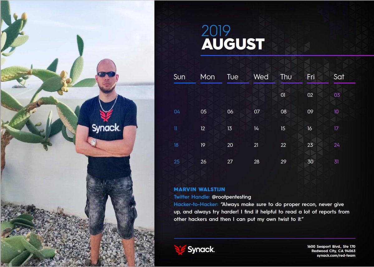 @rootpentesting as our featured Synack Red Teamer of the month. His hacker-to-hacker tip: Always do proper recon, never give up, and always try harder!#SRTcalendar2019#SRThackertohackerpic.twitter.com/vl8bJBWrNG