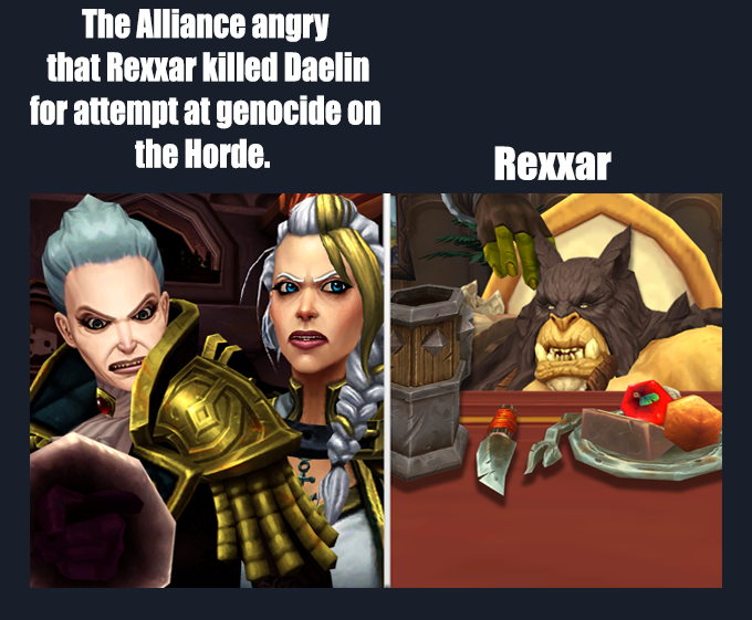Jaina just seemed like an accurate person to include especially with how she goes, "I'm listening now." when referring to the words of her father. Again it's a shame we never saw any story involving Rexxar and Jaina despite it kind of building up to that.
