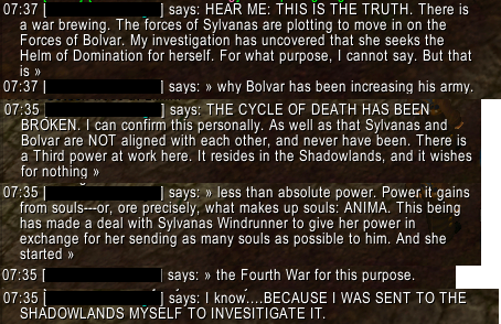 Don't metagame Shadowlands in RP. No namedroping realms, no talk about Anima, and for sure no telling people you know about the situation with the Maw. ICly we would prefer to learn this when Shadowlands hits, and we'll just pretend we didn't hear your meta commentary on it.