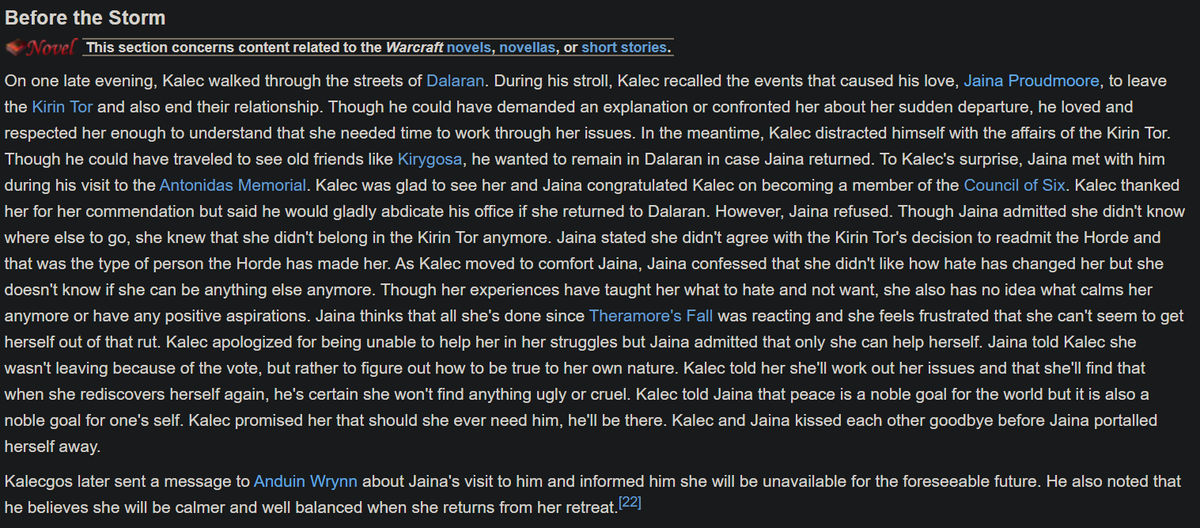 *shrugs* I guess we'll see what happens Blizz might've abandoned the kalecxJaina storyline made it fade to black to which we will never hear about it again or they'll have something focused on them in the future, like I said I guess we'll just have to wait and see.