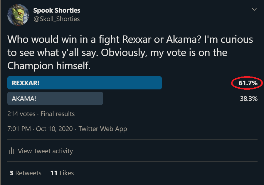 Akama is part rogue, Rexxar has the enhanced smell and hunter tricks to track him down. Akama may have some lightning but Rexxar had the animal kingdom backing him up. Rexxar one shots easily
