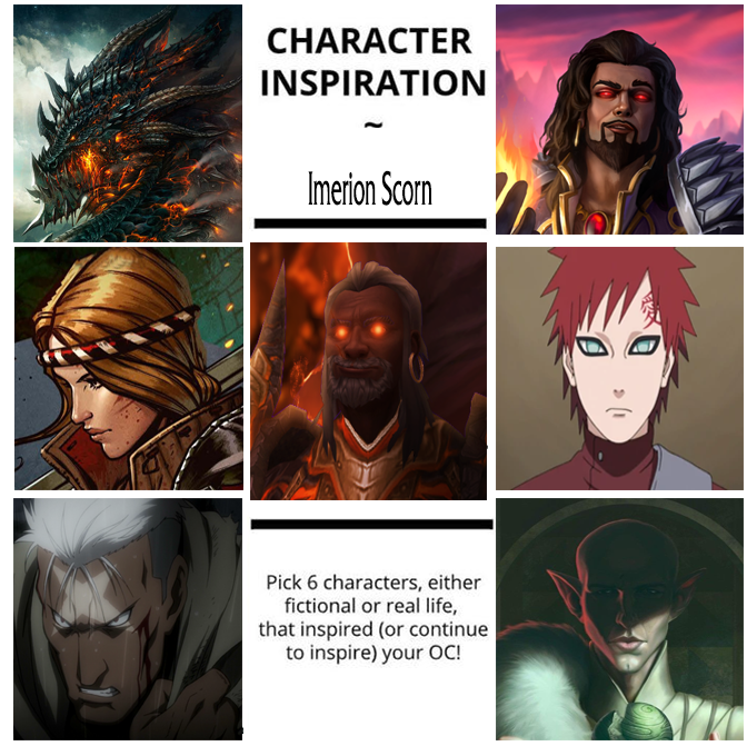 Wanted to do one of these for Imerion because why not? Characters are: Deathwing (WoW), Wrathion (WoW), Saskia (Witcher II), Gaara (Naruto), Scar (Full Metal Alchemist Brotherhood), Solas (Dragon Age)pic.twitter.com/THHwTYUbLP