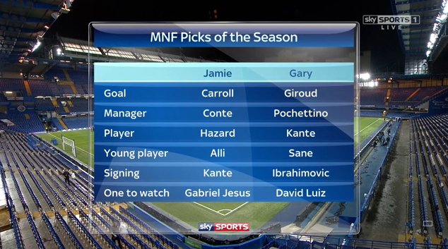 The MNF AwardsJamie Carragher and Gary Neville named their top player, manager and signing of the season plus many more on Monday Night Football.Thanks. Twitter will use this to make your timeline better. Undo -