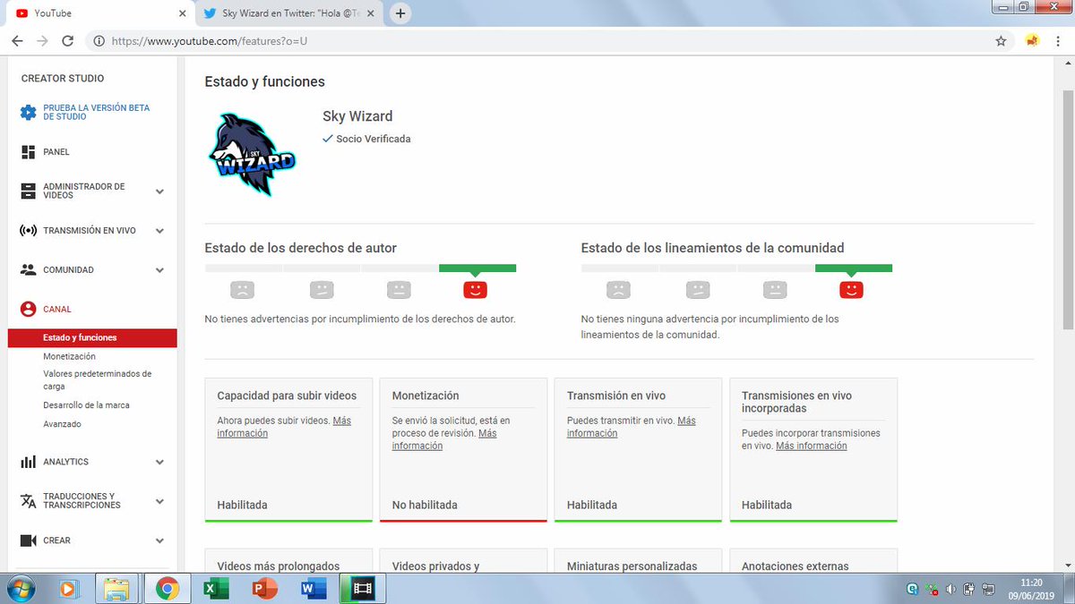 Ahi esta la pestaña de estado y funciones mas la pestaña de monetización para que que se asegure que cumplo con todos los requisitos.pic.twitter.com/N3Gau1wlGy