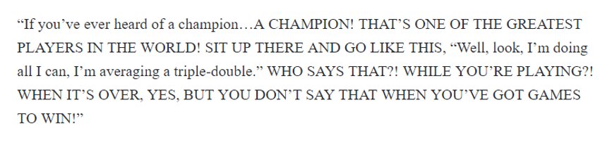 Reporter: Does guarding KD take a toll on you? LeBron: Do I look tired? I'm averaging a triple-double in the Finals