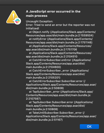 Sorry for the trouble, Erik. We’re currently investigating reports of such errors from the Slack app downloaded from the App store. Could you do a clean install from our website please? https://slack.com/downloads/mac . You can also follow along here for updates:https://status.slack.com/