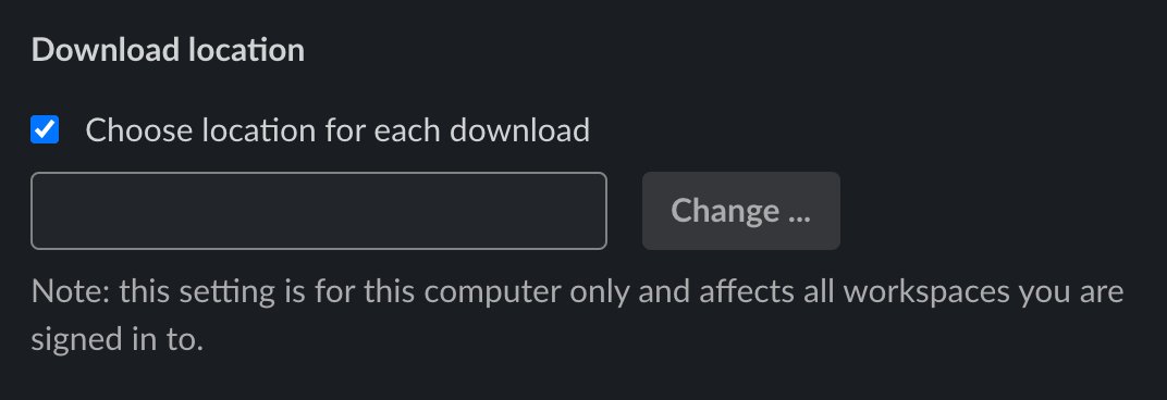 Hey Slack, This works great, but I always have to copy the files over to the correct location. Can't I get slack to always ask me where to download to?pic.twitter.com/0Rcp3Gg7dc