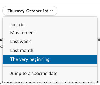 @SlackHQ In what year or month did you first add this wonderfully simple available click through to The Very Beginning of any channel, if I may ask?