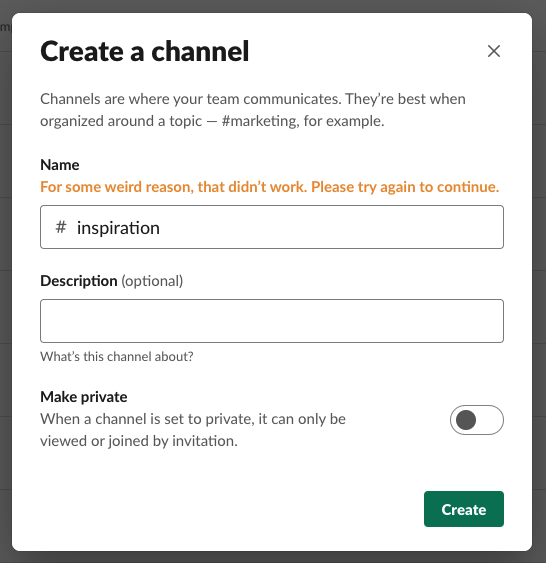 Ooh, that's a vague one. Sorry about that. Usually we see this when Workspace Admins/Owners have locked down channel creation. You'll need to reach out to them to be sure — apologies for the confusion!https://my.slack.com/account/workspace-settings#admins …