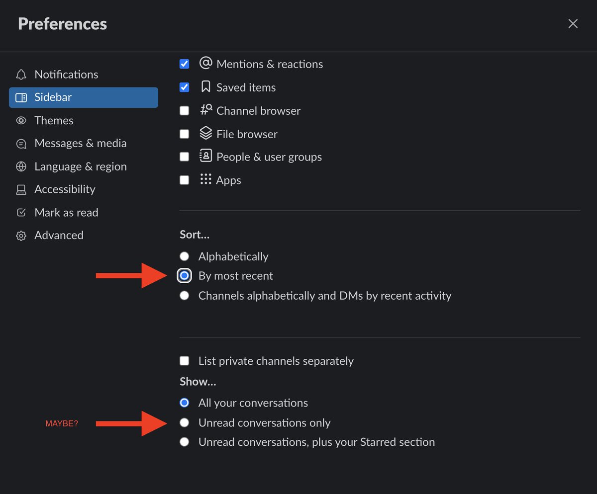 Sorting sections by unread on top was a helpful tip, but the global "sort by unread" in sidebar preferences that you're showing me in the screenshot. I don't have that one. on a paid planpic.twitter.com/vWUT5dzZ8S