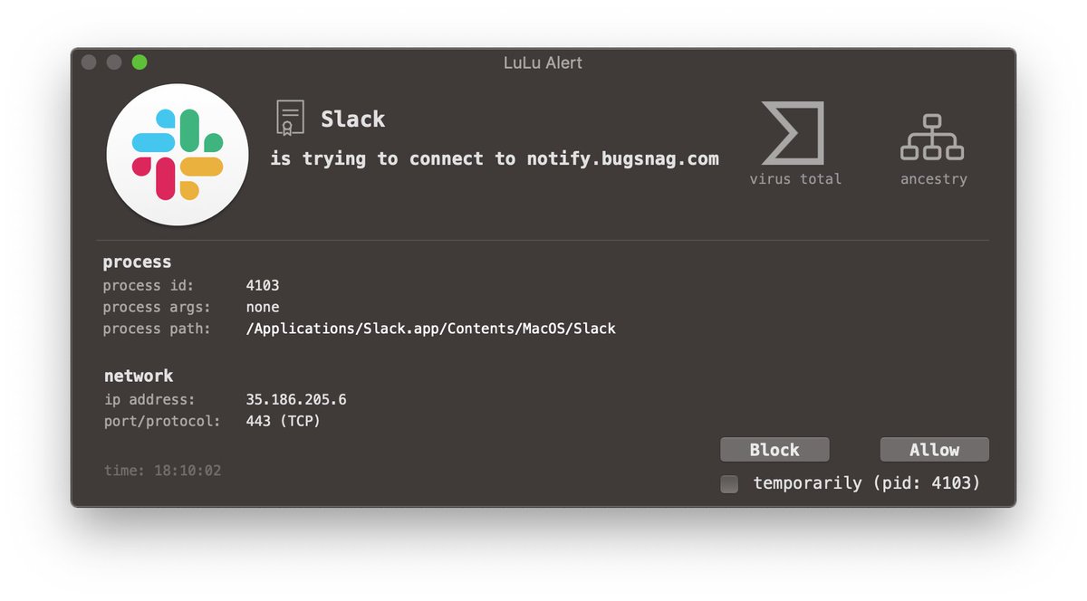 Hey @SlackHQ, a new version of your app seems to be making a new connection to http://bugsnag.com , and ironically enough, if I deny it, the app reports a problem and totally stops responding... That probably shouldn't happen (What happens if bugsnag really isn't available?)pic.twitter.com/y1UP3Vx4UO