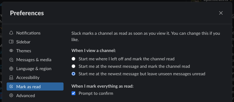 eg. in a channel I see the 'New' indicator. I'm able to configure things so that if I 'pop in' to a channel it won't automatically mark things read. Though it does seem that if there's only a couple of messages (that don't scroll beyond the screen), then it still marks them readpic.twitter.com/V1OuBEDb2y