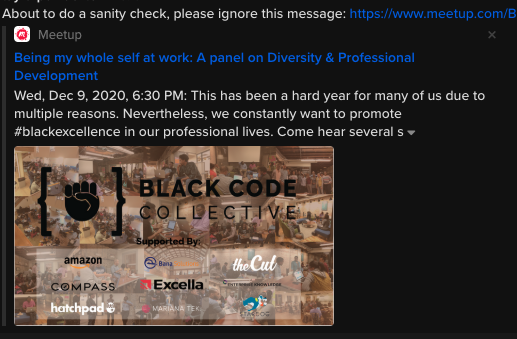 @SlackHQ I believe you have a bug in how you generate previews for links. When I share the link for a @blkCodeCollctve event within Slack, the incorrect event details show. The preview renders fine in other apps I've tested.pic.twitter.com/7dYGjF5eNW
