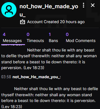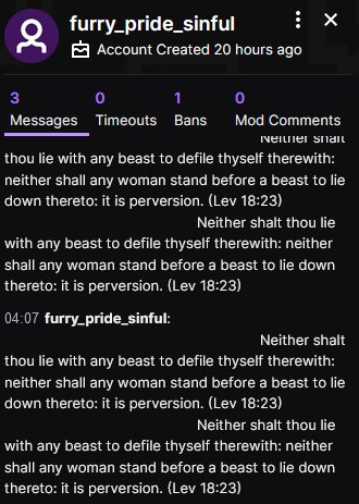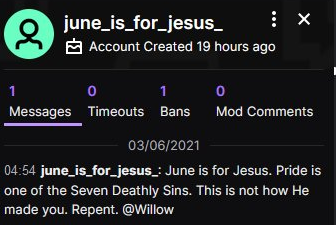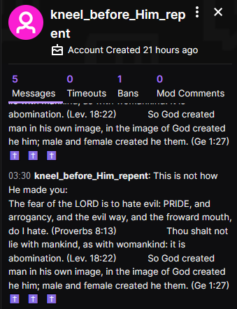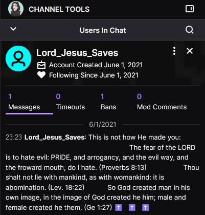 since Twitch added the trans tag to begin pride month, someone has created several bot accounts with names like 'Lord_Jesus_Saves' and 'furry_pride_sinful' to spam god-fearing hate messages in trans streamers chats, which is both awful and ridiculouspic.twitter.com/oqj4TQjbWK