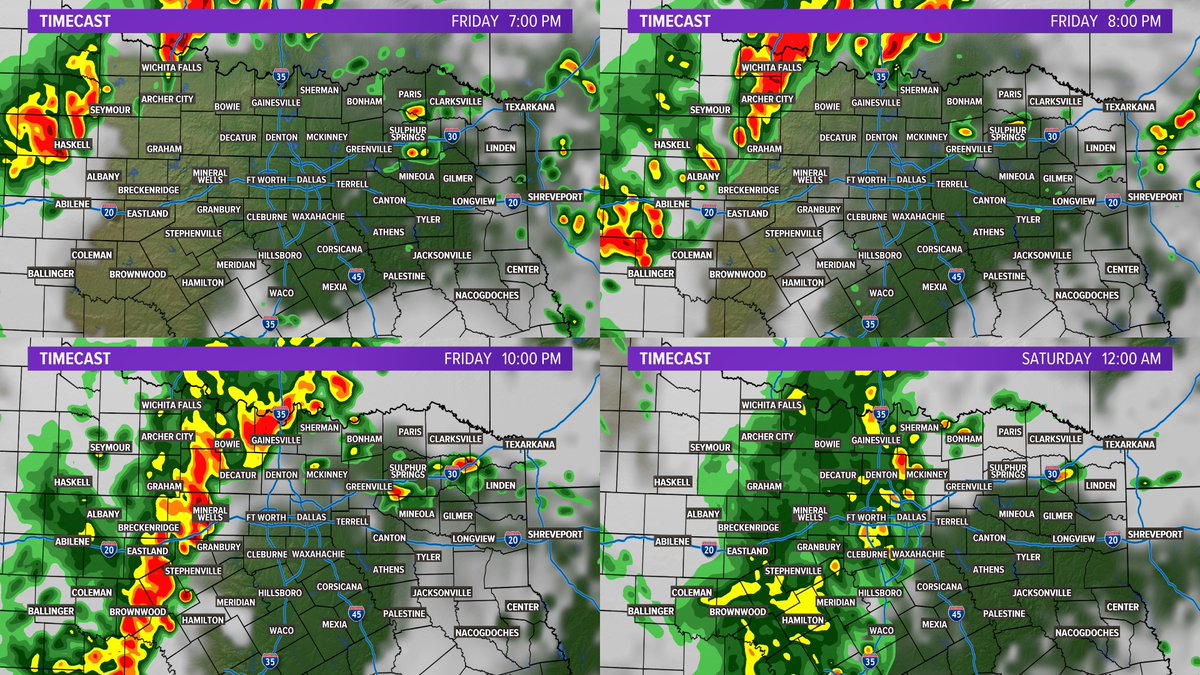 3:30pm Update: No big changes. T-storms will move into North Texas from the north and west this evening into tonight. Western/northern areas will see storms arrive thru 10pm with the DFW area likely not seeing storms until after 10pm. Wind/hail still the primary severe threat.pic.twitter.com/ThNejo2ITf