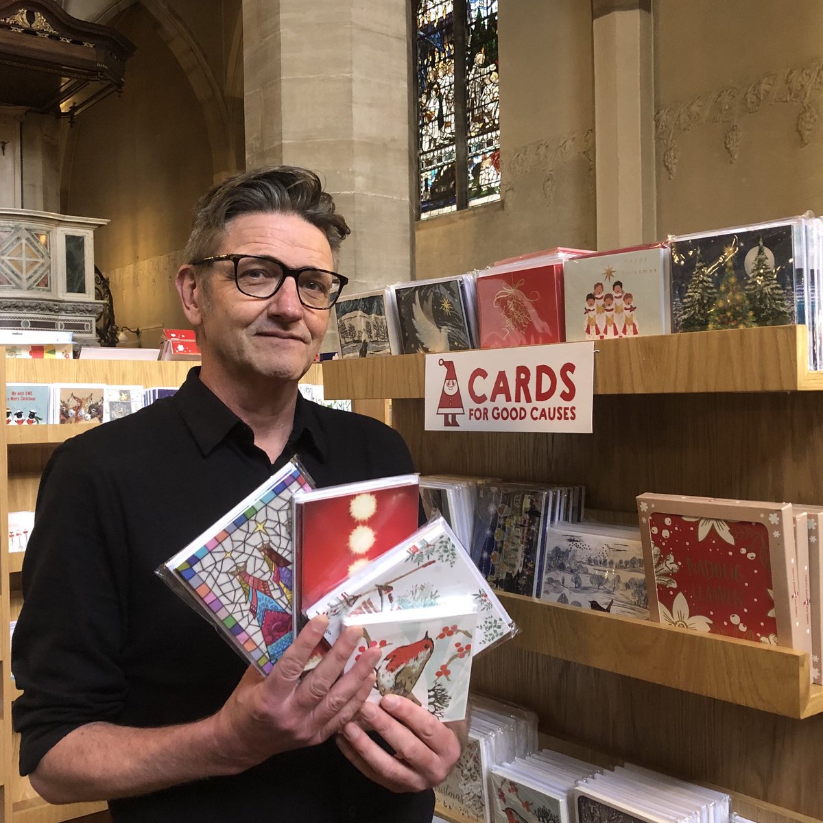 Our charity Christmas card shop is doing great business and is open Monday to Saturday from 10am to 5.30pm. There’s a warm welcome from Cards for Good Causes staff Stephanie and Christina and an opportunity to see our own picture postcard stained glass!