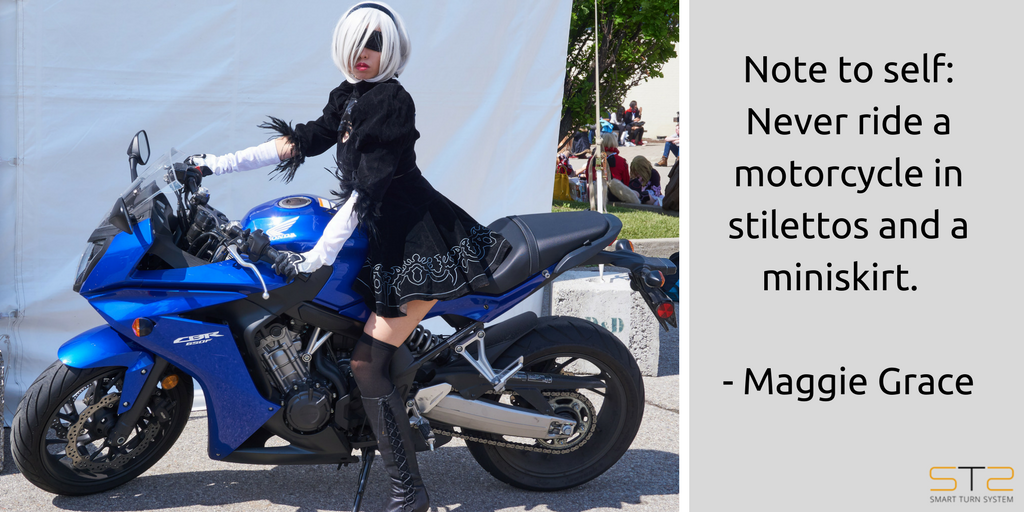 Note to self: Never ride a motorcycle in stilettos and a miniskirt. - Maggie Grace :D :D