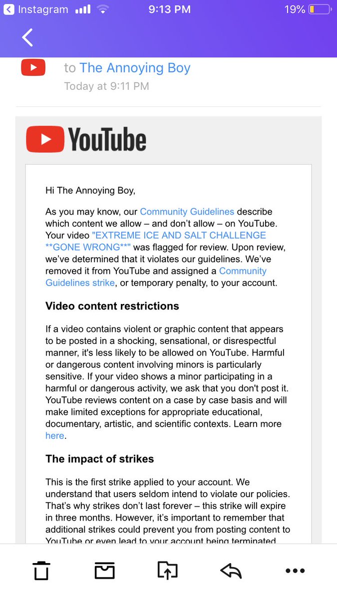 Out of all the salt and ice videos mine gets taken down and I get a strike on my channel why don’t the other youtubers who did the challenge get a strike or get their vid taken down @TeamYouTubepic.twitter.com/z9IQ3T4dP1