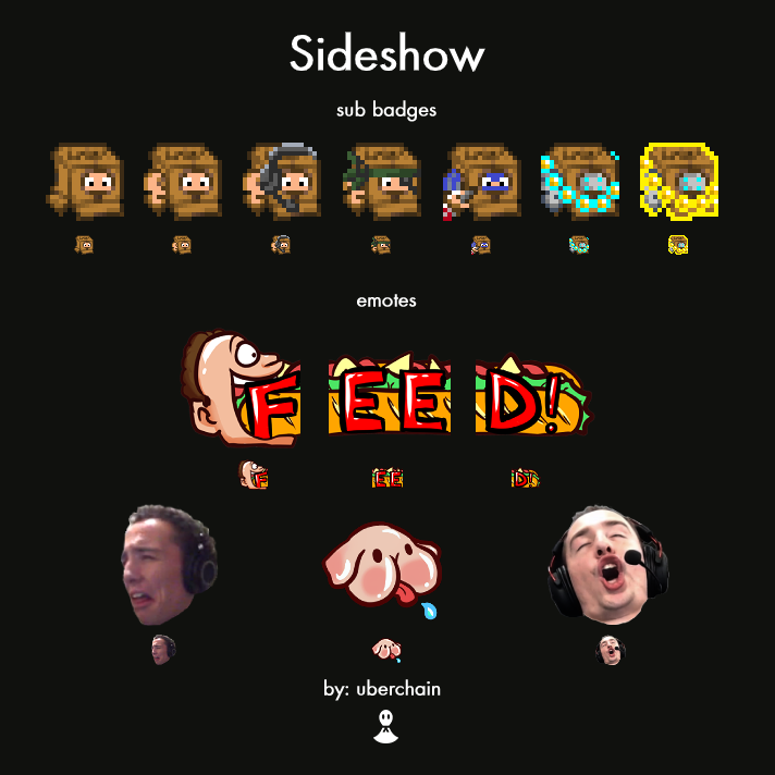 🚨 NEW EMOTES 🚨 The talented @uberchain has drafted 4 new emotes for Sideshow subscribers! FEEEEEEEEEEEED! (an instant classic) ...and Jasper the dog who wants you to eat his ass... ... that 2nd one might not be such an instant classic idk http://twitch.tv/sideshow pic.twitter.com/LafBunvn5v