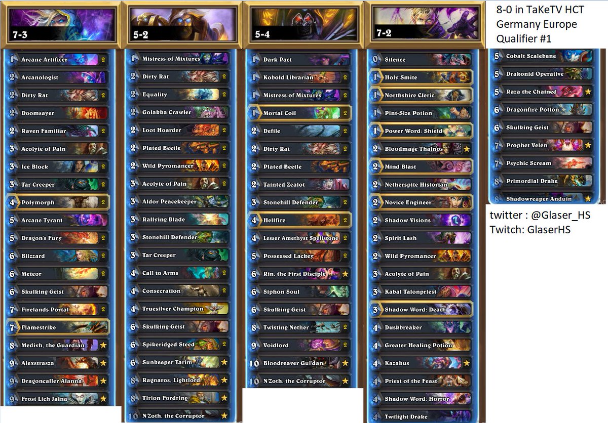 My 8-0 line up that got me qualified to @TaKeTV HCT Germany Europe offline top 16! W-L of decks in picture, Priest, and mage was 11-3 if you count the Global Qualifier as well(Didn't play pally in that one tho) My ban was warlock.pic.twitter.com/oX61HIB425