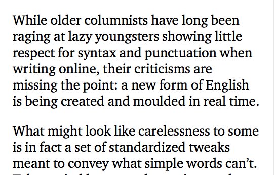 @youngvulgarian. Across any community, language conventions vary – and they change at varying rates. This is very visible in online writing, a young set of formats whose features drive new conventions. https://www.chathamhouse.org/publications/twt/joys-online-syntax# …pic.twitter.com/l1mXheKIeP