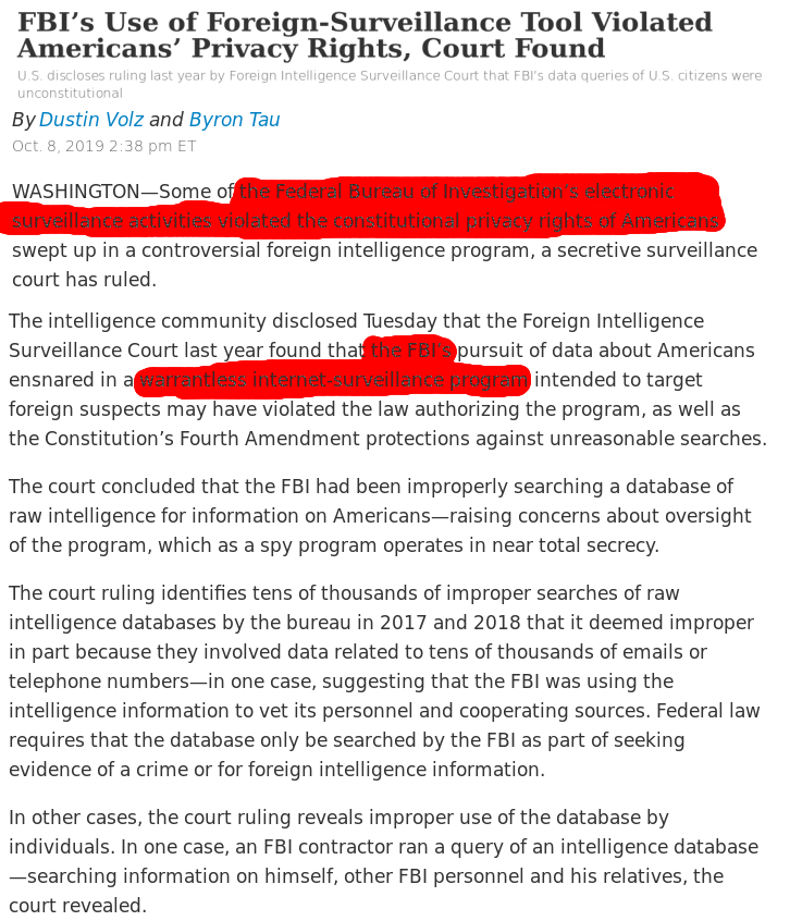 @FBI is running a warrantless internet surveillance program so flagrantly unconstitutional that even the secret, rubber-stamp "court" that approved 99.967% (!) of surveillance requests over 33 years (!!) felt they couldn't turn a blind eye. https://www.wsj.com/articles/fbis-use-of-foreign-surveillance-tool-violated-americans-privacy-rights-court-found-11570559882?mod=rsswn …pic.twitter.com/fBdh8Bbd5f