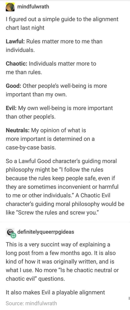 Like this overall, though I don't necessarily agree that a lawful character has to care more about rules than people. Would say that even a well-intentioned person who felt that way would be stuck in LN or LE; see also: Javert.https://twitter.com/BDaveWalters/status/1285093293164883970 …