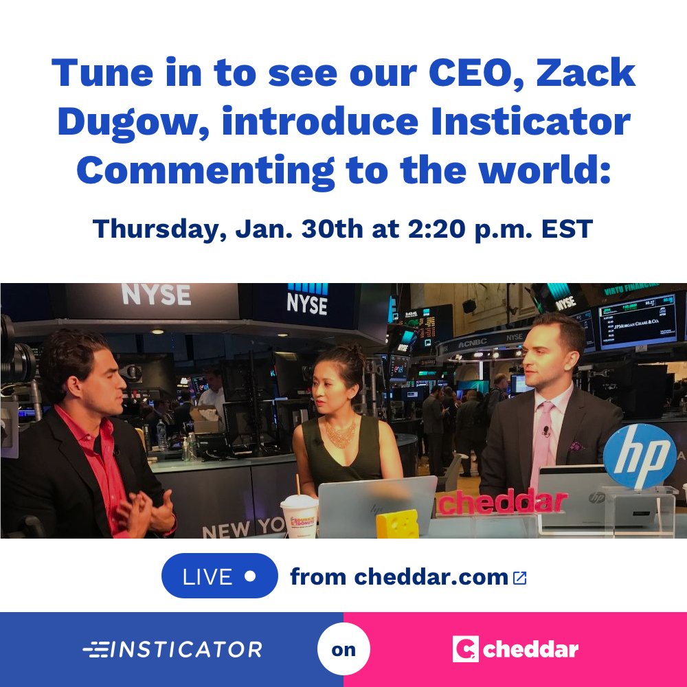 @ZachDugow will discuss our newest engagement product, Insticator Commenting, live on@cheddar. 2:20 p.m. EST -- don't miss it!pic.twitter.com/lsm4AV9qlh