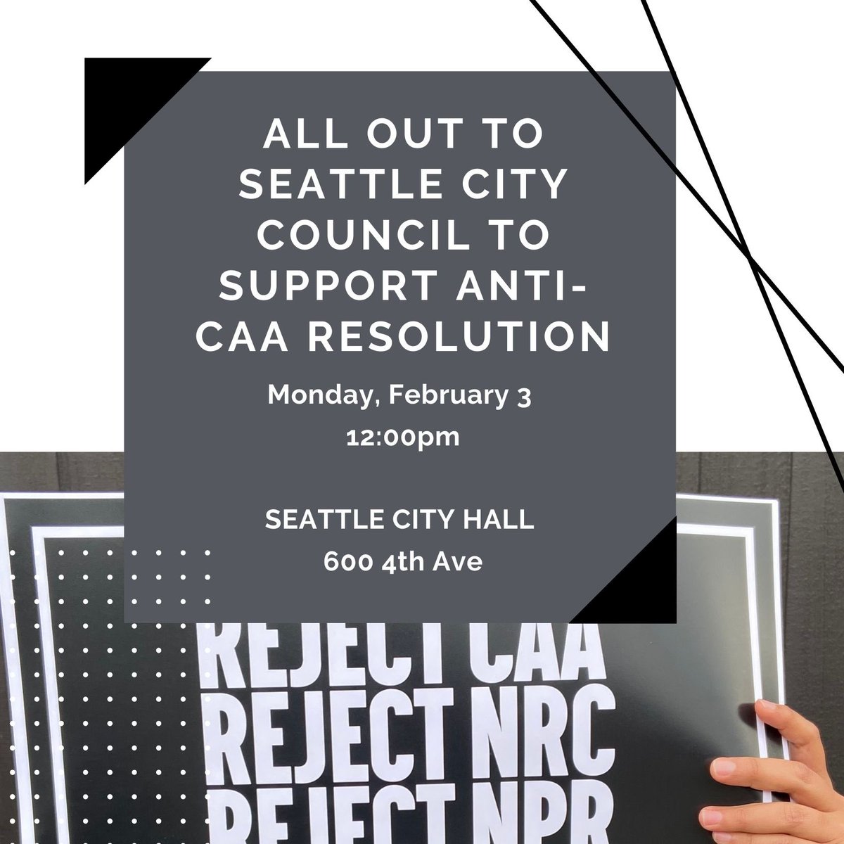 #Seattle! Due to the postponement of the vote for Resolution 31926, we're mobilizing for February 3! This historic resolution by@cmkshama will draw a line in the sand: South Asians#RejectCAA and we want to#StopGenocideInIndiapic.twitter.com/os2WnHrwaQ