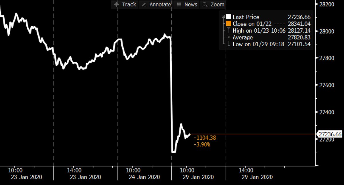 #ChinaCoronaVirus and it's down +3% with almost every stock in the index declining. https://bloomberg.com/news/articles/2020-01-29/hong-kong-reopens-to-crisis-as-virus-tests-market-resilience … by@TianChen95 &@SofiaHC1pic.twitter.com/eIJgj5FUAx