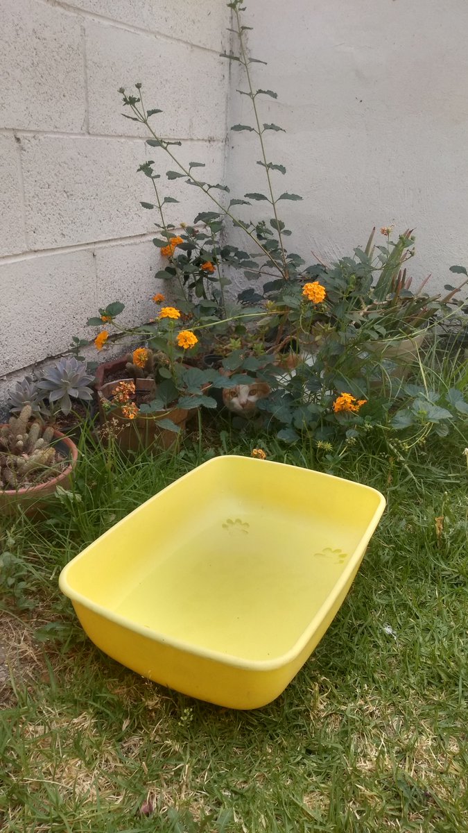 Puse una tinita con poquita agua por si algún pajarillo quería tomar agua y vean lo que hace la Chuchis.