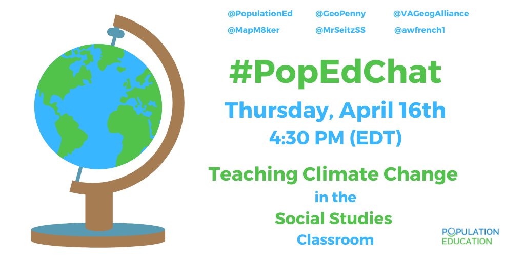 Join us for a special Earth Day #PopEdChat on 4/16 at 4:30 PM (EDT)! We'll share resources and talk about teaching climate change in the SOCIAL STUDIES! With special guests @VAGeogAlliance @GeoPenny @MapM8ker @awfrench1 @MrSeitzSS