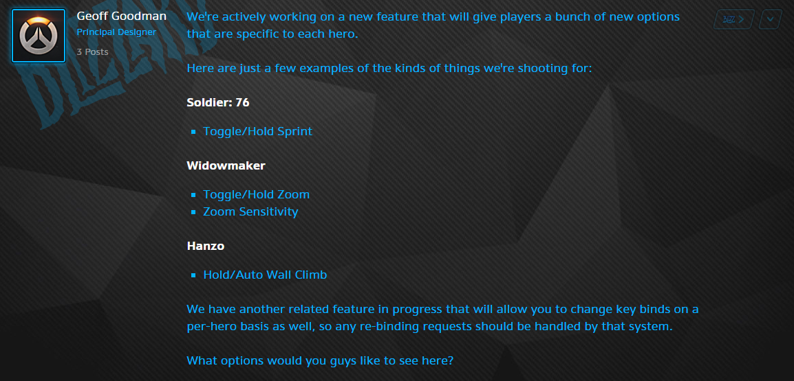 What hero-specific options would you like to see in Overwatch? Tweet us your ideas! (Via: http://blizz.ly/20Xx4Fp ) pic.twitter.com/DkVzEdxlqV