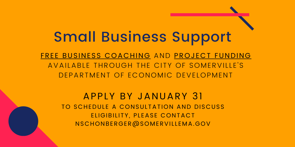 Small businesses in Somerville don't have to go it alone! Apply by January 31 for FREE business coaching and project grants. To learn about this program and other resources through the Economic Development Department, please visit http://bit.ly/2NvajeZ .pic.twitter.com/6hKDtLT2Dr