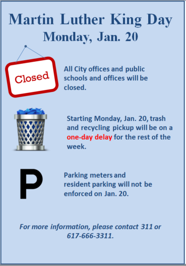 Here are some things to keep in mind this long weekend: All City offices & public schools will be closed for MLK Day on Monday, Jan 20. Parking meters/resident parking won't be enforced on Monday. Trash/recycling pickup will be on a one-day delay for the rest of the week.pic.twitter.com/cJiFqCJXLG