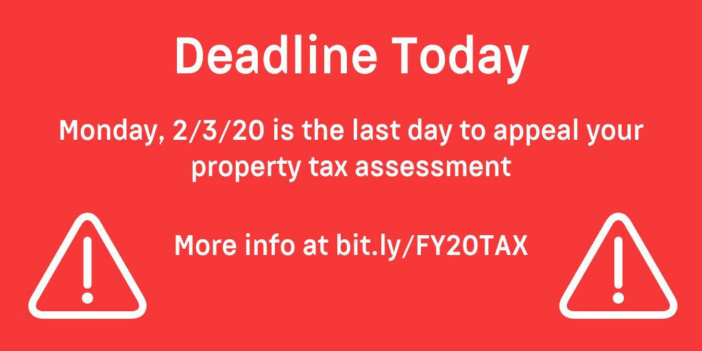 If you've been letting this sit on your to do list, don't forget that today is the FY20 deadline to file an appeal of your property tax assessment with the Board of Assessors. Learn more at http://bit.ly/FY20TAX .pic.twitter.com/5sCPJrZlEW