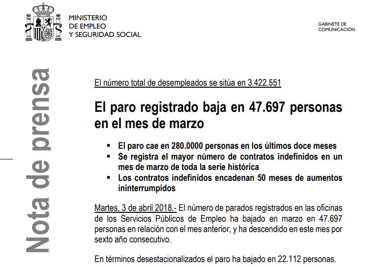 #paro registrado baja en 47.697 personas en el mes de#marzo, el número total de desempleados se sitúa en 3.422.551 http://prensa.empleo.gob.es/WebPrensa/noticias/laboral/detalle/3249 …pic.twitter.com/A2SCvs0KIL
