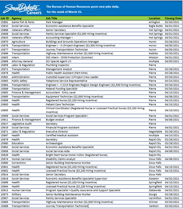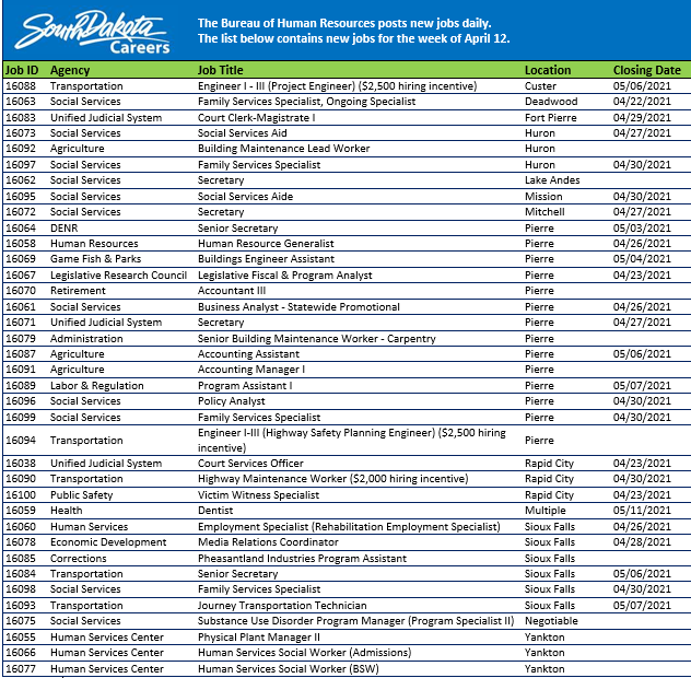 Happy Monday! Here is a listing of our jobs posted last week. To learn more or to apply visit https://bhr.sd.gov/workforus , click all open positions and search for the Job ID. To receive weekly emails about new openings here http://tinyurl.com/getnotifiedSDjobs ….