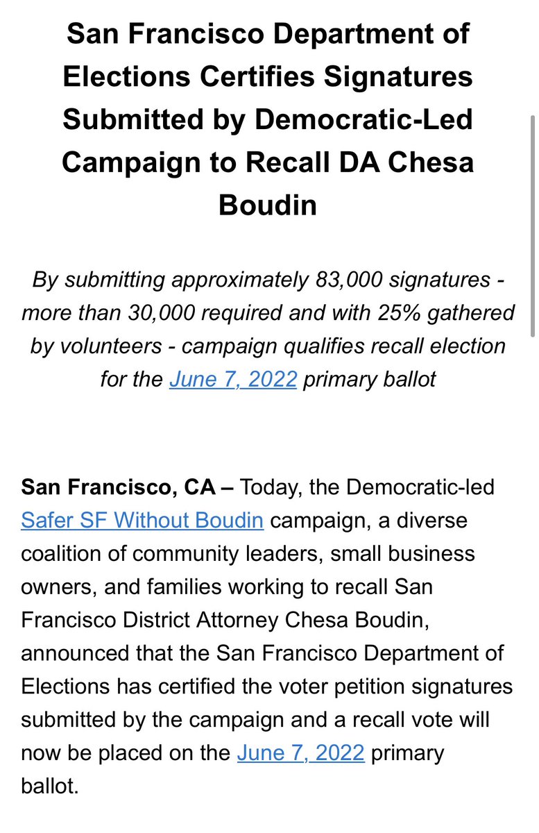 Breaking: Recall of San Francisco DA @chesaboudin qualifies for ballot, will be put to voters June 7, after #recallChesaBoudin campaign submits almost 3 times as many petition signatures as required. pic.twitter.com/o8ga9KViLh