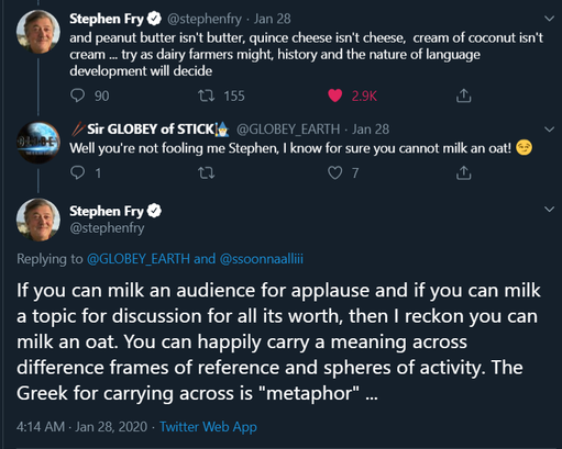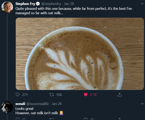 Today's vibe is: Stephen Fry sticking up for little plant milk (◡‿◡ ) ノ