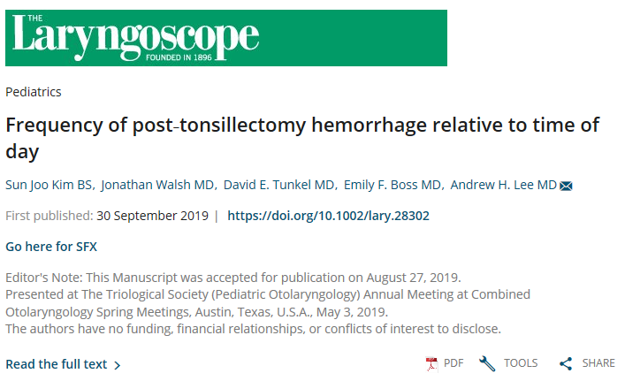 @HopkinsMedicine demonstrating more post-operative tonsillectomy bleeds at night compared to the day. Related to circadian rhythm of clotting factors?