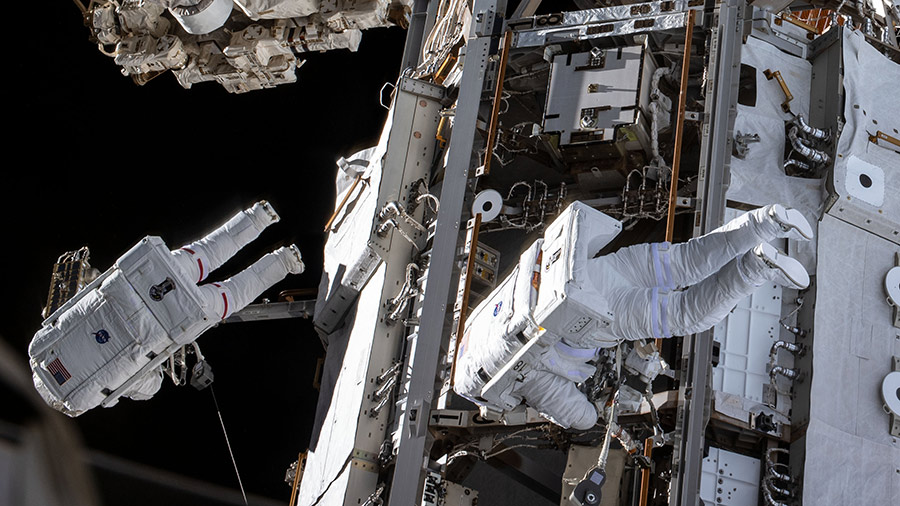 @AstroDrewMorgan and@Astro_Luca on a spacewalk to finish repairs on a cosmic ray detector.@Astro_Jessica and@Astro_Christina helped the duo from inside the station.pic.twitter.com/PEO4OdDt5CSpacewalkers Repair Cosmic Ray DetectorThis time-lapse video shows @AstroDrewMorgan and @Astro_Luca on a spacewalk to finish repairs on a cosmic ray detector. @Astro_Jessica and @Astro_Christina helped the duo from inside the station. -