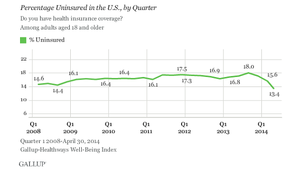 MT @NancyPelosi: America's uninsured rate has dropped to 13.4%, the lowest since 1/2008!