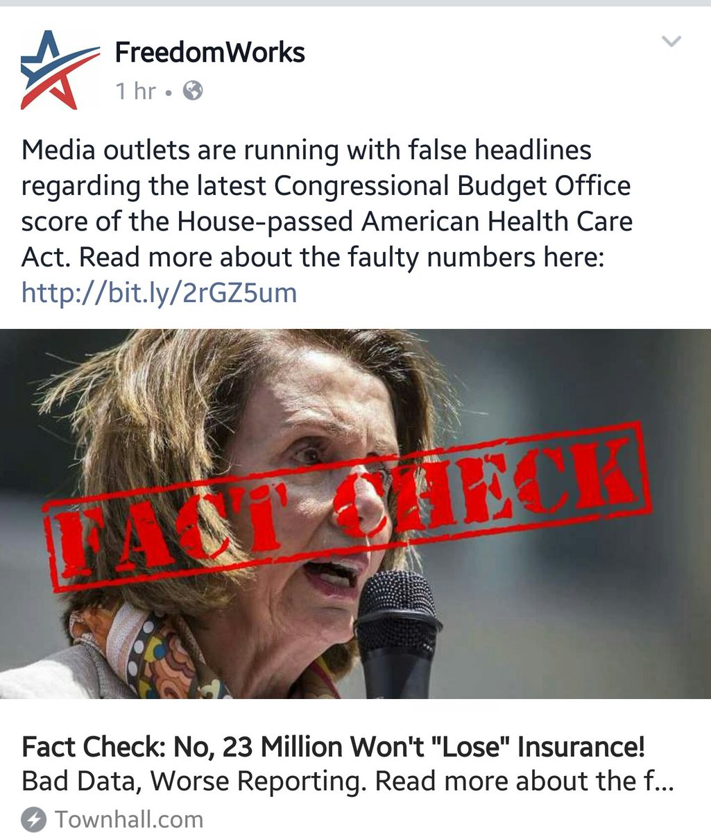 #FakeNews from Nancy and her cronies about#AHCA No, 23 million people will NOT lose health insurance! http://bit.ly/2rGZ5um pic.twitter.com/QqhRP6pLSU