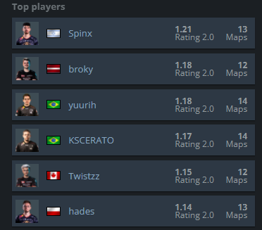 EZ4SPINX The Israeli rifler stood out in Group B as the top-rated player with the highest KPR (0.79) and 1+ kill rounds (52.6%) yuurih lands at #2 over broky with a higher map count and group-high 83.7 ADR