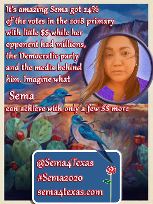 @_SemaHernandez_ for US Senate from Texas. Read her platform: https://www.sema4texas.com/issues/ Donate: https://secure.actblue.com/donate/sema4texas …#Sema2020https://twitter.com/cynicsanonymous/status/1224105535772987396 …